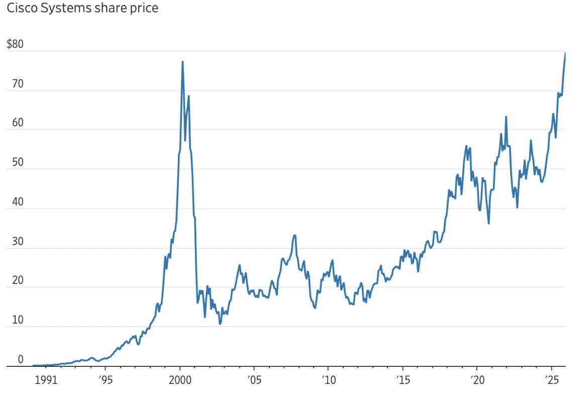 Recuerdo que, cuando estalló la burbuja de las telecomunicaciones, leí artículos optimistas que argumentaban que Cisco cotizaba «solo» a 30 veces sus ganancias. Si compraste Cisco entonces, a «solo» 30 veces las ganancias futuras —y esas estimaciones de ganancias se basaban en proyecciones poco realistas—, te llevó literalmente un cuarto de siglo, una generación, recuperar tu dinero.